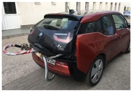 The third of the research objects was an electric vehicle fitted with a range extender (combustion engine). In this case, the combustion engine served the purpose of an emergency power generator. Its power output was merely 28 kW (Figure 5). Selected data related to the research object are presented in Table 2. The fundamental indicator describing the dynamics of vehicles is their unit power. It is the quotient of the maximum usable power of the engine and its gross vehicle weight. Calculating the indicator for vehicle A gave a value of 0.55 kW/kg, and for vehicle B, a value of 0.53 kW/kg was obtained (Table 2). Therefore, the difference in these ratios is only 3.5%. It is therefore acceptable to compare the two vehicles on the basis of the unit power factor.