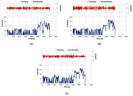 According to the RDE requirements, the first stage was the urban drive. The distance that vehicle A covered at this stage was 32.4 km, which was 39.2% of the total time. Vehicle B covered a distance of 29.4 km, and vehicle C covered 35.1 km. The vehicles also fulfilled the time-share requirement. For the rural drive, the greatest distance (25 km) was covered by vehicle A. A similar situation occurred in the highway portion of the test, where vehicle A covered a distance greater by 3.5 km compared to vehicle B. All vehicles fulfilled the requirement of the time share of the individual drive stages and the maximum stationary time in the urban cycle. During the highway cycle, the vehicles did not exceed the speed of 145 km/h; hence, the requirement of not exceeding a speed of 145 km/h for more than 3% of the cycle time and a minimum of 5 min of driving in excess of 100 km/h was fulfilled. The smallest change in the accelerations of the research objects was recorded for the highway cycle (Figure 6).