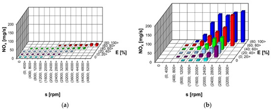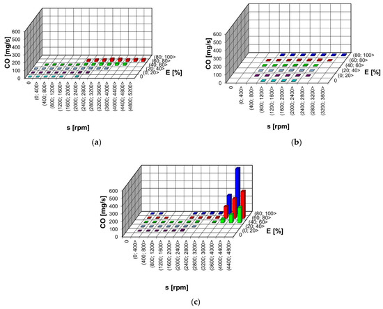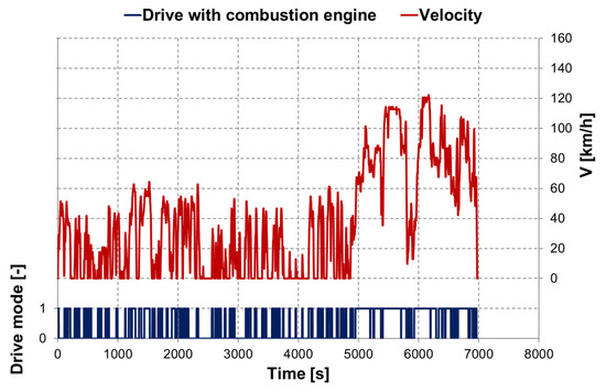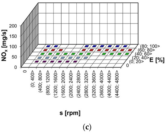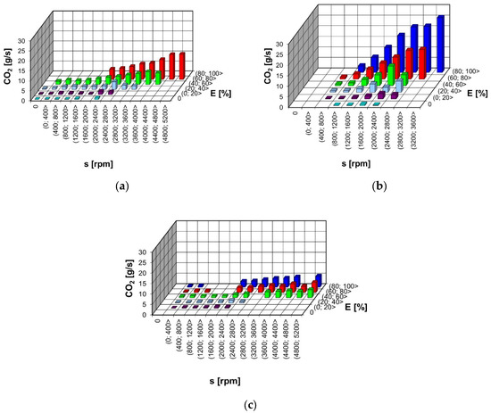In order to determine the operating conditions of the combustion engines, the authors used the characteristics of the operating time share in the engine speed and load intervals. When analyzing the obtained data, the authors observed that, approx. 50% of the time, vehicle A used the electric motor. The combustion engine operated in the engine speed range S (1600; 2800>, at the load E (40; 60%>. Given the fact that its main source of power was the combustion engine, the characteristics of vehicle B were more elaborate compared to vehicle A. Approx. 20% of the time, the engine operated in the speed range (400; 800>, at the load (0; 20%>. The values of (1200; 1600> can be assumed as the main engine speed intervals, which directly result from the characteristics of diesel combustion engines (a lower speed range compared to the spark ignition engine). In the case of the last vehicle, where the combustion engine served the purpose of a range extender, two main ranges of loads needed to be distinguished. The first one, relating to the operation in the electric mode (approx. 20%), indicated that the vehicle had surplus energy and did not require the combustion engine to activate in order to extend the vehicle range. The second range was the exclusive operation of the electric motor, 30% of which was the operation at the load of (80; 100%>. For electric vehicles fitted with range extenders, this situation should not occur, as the energy surplus in the batteries should be sufficient to meet the demand of the powertrain (Figure 9).