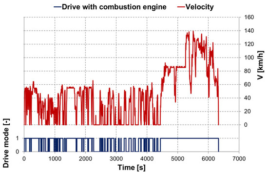 When investigating vehicles utilizing hybrid powertrains or range extenders, it is justified to determine the extent of use of the electric equipment during the drive. In order to determine this, it is necessary to perform an analysis of the engine usable parameters. The engine speed is fundamental in this case. For the analysis, the authors adopted a 0–1 system, where 1 denoted the use of the combustion engine only, and 0 the electric motor only. The analyses did not include the mode of the parallel operation of the engine and electric motor. In the entire RDE test, the level of hybridization for vehicle A was 54%, and for vehicle C, it was 29%. Therefore, the first of the analyzed vehicles used the electric motor to a greater extent. It is noteworthy that vehicle C is classified as electric, and the combustion engine exclusively serves the purpose of an auxiliary power source (battery charging). During the test drive in the highway cycle, vehicle A operated several times using the electric motor exclusively (Figure 7 and Figure 8). This phenomenon is characteristic of hybrid vehicles, as the highway cycle is characterized by an increased energy demand that must be supplied mainly by the combustion engine. The phenomenon of braking energy recuperation does not occur often either, which is tantamount to the fact that, during highway driving, the batteries are hardly ever charged. In the case of vehicle C, the use of the electric motor was not recorded. The vehicle fitted with the conventional powertrain was not taken into account, as it was not fitted with an alternative powertrain.