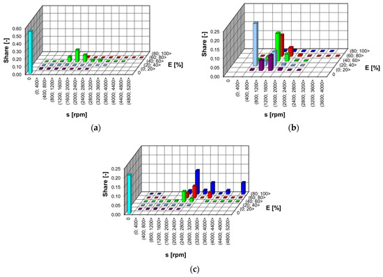 Operating time-share characteristics depending on the combustion engine speed and load: (a) vehicle A; (b) vehicle B; (c) vehicle C.