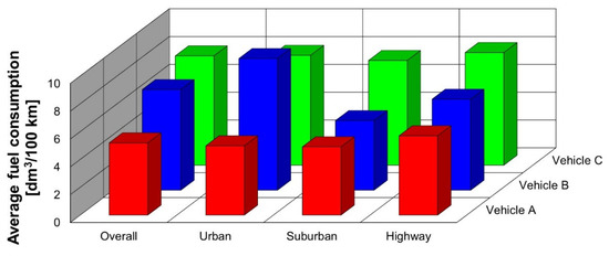 The average values of the fuel consumption are shown in Figure 13, along with the average consumption on the individual road portions. Based on the obtained results, one can observe that all three research objects had the lowest average fuel consumption in the rural portion. In each part of the test, vehicle A (HEV) had the lowest fuel consumption. Similar conclusions were drawn by the authors of [32], who compared an HEV vehicle and a conventional gasoline vehicle. A comparison of the fuel consumption of conventional and hybrid vehicles was also performed by the authors of [34]. Their analysis showed a significant fuel economy of the vehicle fitted with the alternative powertrain. The investigations described in [35,36] showed that HEV vehicles were characterized by a 23–49% lower fuel consumption compared to the combustion engine vehicles. It is noteworthy that, in the discussed investigations, the lowest fuel consumption of the HEV vehicles occurred in the urban cycle of the performed test.