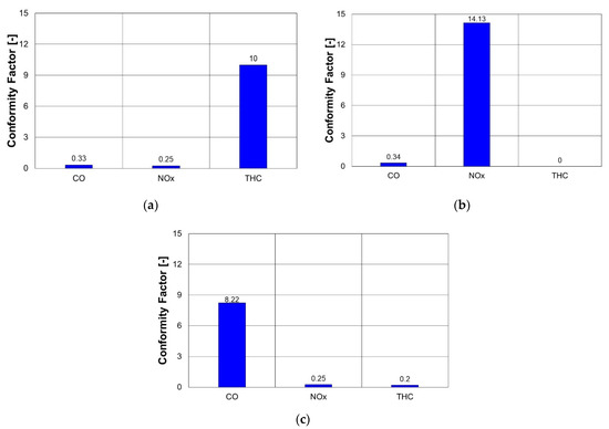 Conformity factors of the objects under investigation: (a) vehicle A; (b) vehicle B; (c) vehicle C.