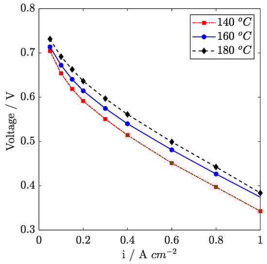 Figure 2, polarization curves recorded at 140 °C, 160 °C, and 180 °C are presented. The temperature values are chosen to be consistent with previous works [