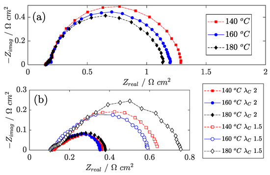 Figure 3b, it is observed that the 45° linear branch at high frequency is longer at a cell temperature of 180 °C than of 160 °C, and this is even more evident if comparison is made between spectra at low cathode stoichiometry (