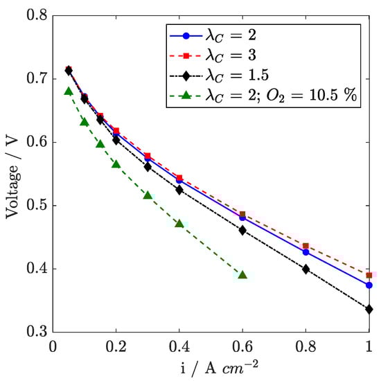 Figure 5a,b. The increase in air stoichiometry generates a positive effect on the polarization curve in the medium-high current density range, while roughly no effect is observed at the low current density, probably because of the constant flow operation in this region (below 0.2 A cm