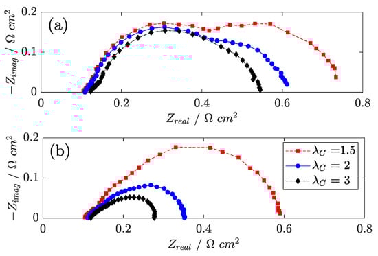 The effect of the anode stoichiometry is very limited, and the results are not reported for conciseness. Since pure hydrogen is employed, the anode kinetics is extremely fast and has negligible effects both on the polarization curve and EIS, consistently with what found in the literature [