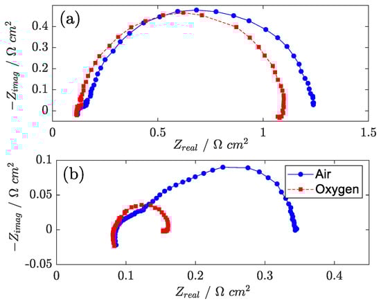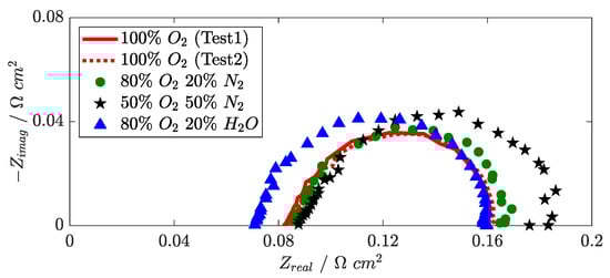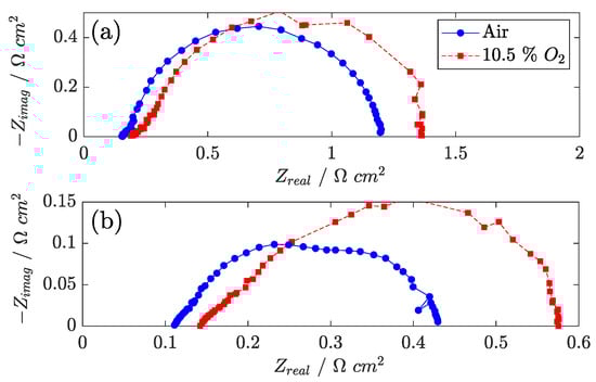Figure 6a,b, respectively. It is observed that the high-frequency resistance increases at any current density, which is reasonably due to the higher flow rate consequent to oxygen dilution, which dehydrates the membrane. For the same reason, the 45° high-frequency linear branch increases, but this could also be an indication that the reaction rate in the catalyst layer is shifted to the GDL side as a result of oxygen transport limitations arising under a low oxygen mole fraction.