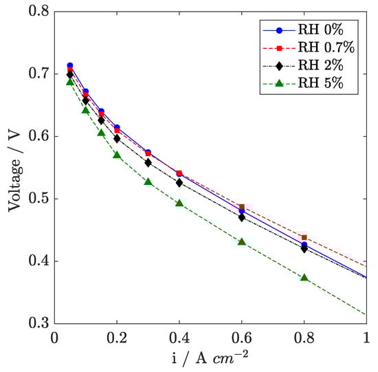 Figure 8, the effect of air humidification on the polarization curve in reference condition is reported for RH ranging from 0 to 5% (160 °C). At low current density, a voltage loss is observed when humidification is introduced, consistent with oxygen dilution, as found in