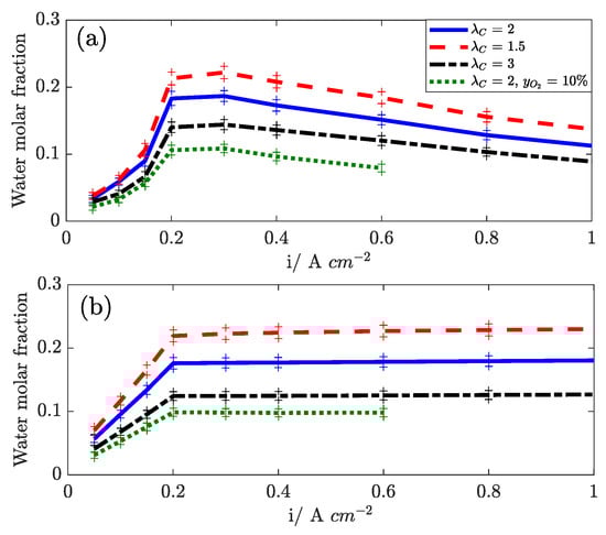 Figure 13, the water mole fraction, as measured at the anode and cathode outlets, are reported versus the current density. The effect of cathode stoichiometry is presented. At low current density, the water outlet mole fraction increases with current density at both sides because of the constant flow operation. Above 0.2 A cm