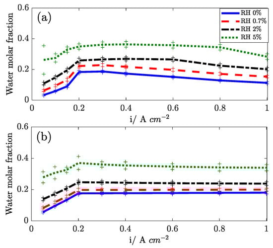 −2, the test is run at constant stoichiometry, and the mole fraction is roughly constant at the cathode outlet, while it slightly decreases at the anode outlet. The water content in the stream depends strongly on the cathode stoichiometry: both at the cathode side (because of dry flow dilution) and at the anode side, confirming that diffusion is the driving force for water transport across the membrane [