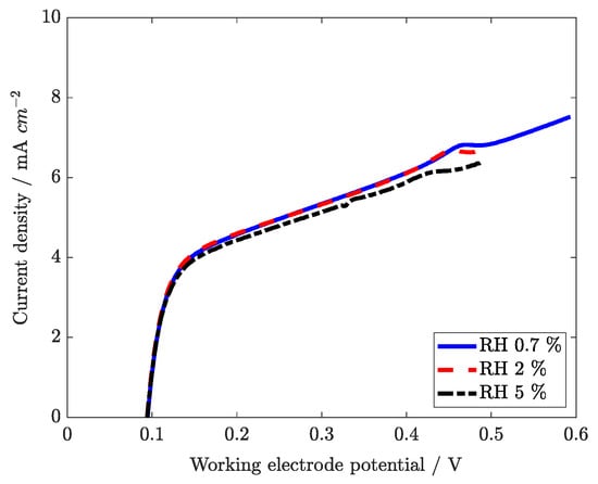 Figure 15, linear sweep voltammetry is presented with increasing RH. The crossover current is quantified as 3 mA cm