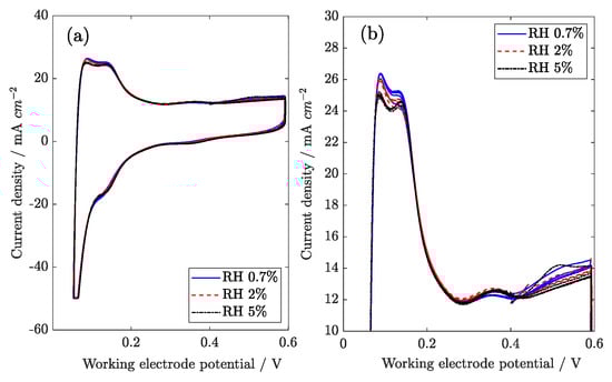 33]. In this sense, a small change in platinum active surface that is observed at higher humidity could be ascribed to adsorption of anions, but further data should be collected to confirm this hypothesis.