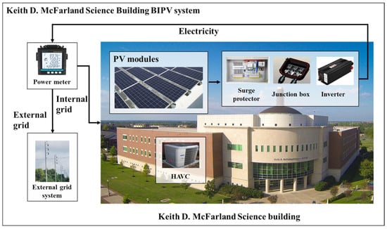 This study considers a BIPV system on the rooftop of the Keith D. McFarland Science Building mentioned in Section 2. Figure 2 shows the BIPV system on the subject building. It consists of PV modules, a surge protector, a junction box, a DC/AC inverter, and a power meter. The generated electricity can be sent to either an external grid system or an internal grid system. Similar to the green roof system mentioned in Section 2, the subject BIPV system has the same rooftop space of 2378.97 m2. Therefore, approximately 1189 mono-facial solar modules (i.e., LG405N2W-V5 with a size of 2 m × 1 m) with frames can be installed. In other words, the subject BIPV system can have a capacity of 481.55 kWp.