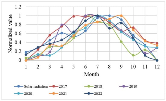 Figure 3 compares the solar radiation and solar energy generation data illustrated in Table 2. The data are normalized according to Equation (1):