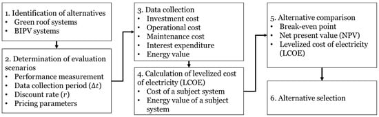 The proposed modeling techniques are used to conduct the economic feasibility comparison between a green roof system and a BIPV system. The electricity generation model is used to estimate the electricity quantities produced by both systems, and the LCOE values are computed for the economic feasibility comparison. Figure 4 represents the procedure of the economic feasibility comparison between green roof and BIPV systems. Once the subject systems are identified, performance measurements such as the LCOE, data collection period, discount rate, and pricing parameters (e.g., unit electricity price per kWh) are defined. In addition, data involving the investment cost, operational cost, maintenance cost, interest expenditure, and energy value are collected to compute the LCOE. After the calculation, an alternative comparison is conducted in terms of the LCOE, net present value (NPV), and break-even point (BEP), and the best alternative is selected. The detailed information is addressed in the following sections.