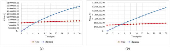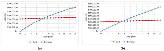 To identify the BEP of the subject BIPV, Figure 8 illustrates the NPVs of cost and revenue over the lifetime of the BIPV system. Similar to Section 4.1, the unit electricity price of USD 0.17/kWh in Texas, U.S. is considered []. The annual income is USD 140,855.86/year from the electricity production of 828.56 MWh/year, and the BEP of the subject BIPV is approximately 5.4 years at an interest rate of 5% and 4.7 years at 2%. Figure 9 illustrates the BEPs over different discount rates from 0.01 to 0.15. Because the BIPV system has a higher annual income than the green roof system, its BEPs are relatively stable under different discount rates.