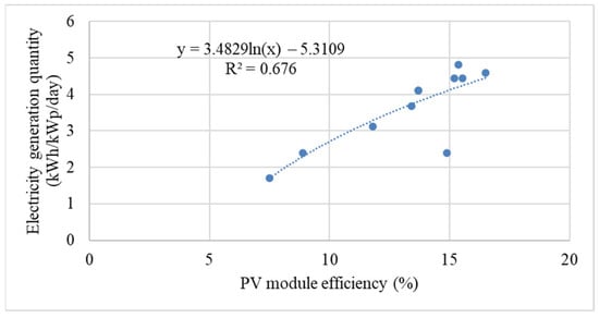 The economic feasibility of the subject BIPV mentioned in Section 3 is analyzed in a similar manner to the green roof system. According to [], the PV module efficiency can vary over the year, and the conversion rate of solar irradiance into electric energy is 6–20%. In particular, in Texas, the minimum and maximum efficiency rates of PV modules are 15 and 20%, respectively []. This implies that the minimum and maximum electricity generation quantities in Texas can be 4.12 and 5.12 kWh/kWp/day, respectively. Figure 6 represents the relationship between electricity generation quantities and PV module efficiency. The electricity generation quantity data under different PV module efficiencies are collected from [,,,,,,,,,]. As the PV module efficiency increases, the electricity generation quantity increases.