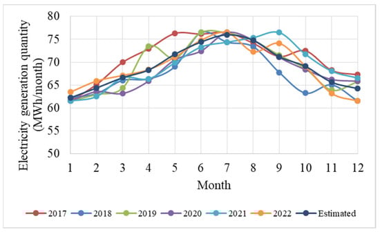 Equation (3) is used to estimate the electricity generation quantities of the six years, 2017–2022, and the R2 values of the 2017, 2018, 2019, 2020, 2021, and 2022 data sets are 83.92, 84.59, 86.94, 91.29, 77.86, and 87.55%, respectively. Note that Equation (5) uses the normalized data according to Equation (1).