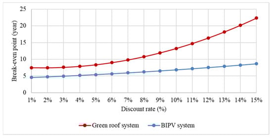 Table 7 shows the values of the LCOE2 of both the green roof and BIPV systems computed by Equation (8) under various interest rates between 1 and 15%. At the discount rate of 5%, the LCOE2 of the green roof system is 39.77% higher than that of the BIPV system. Thus, we can conclude that the BIPV system is more profitable than the green roof system. Although the BIPV system requires higher installation costs than the green roof system, its BEP is 4.7 years shorter than that of the green roof system, due to its higher energy value (or annual revenue shown in Figure 8).