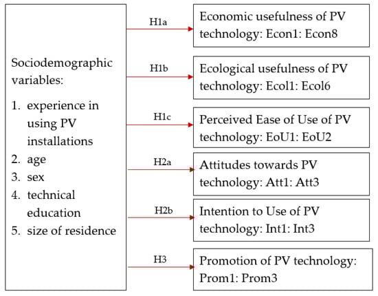 After collecting the survey data, the data were analyzed in two stages. In the first stage, the distribution of answers to questions related to individual constructs resulting from the theory of technology acceptance was described. In the second stage, tests were carried out to determine the dependence of these answers on sociodemographic variables. The examined sociodemographic variables were experience in using a photovoltaic system, age, sex, technical education, and the size of the town. The tests to examine the dependence of the responses on these variables are the Mann–Whitney U (for two subgroups) or Kruskal–Wallis (for more than two subgroups). In cases where significant differences in responses were found between multiple groups, post hoc tests were performed: paired Mann–Whitney U tests between each pair of groups. The research model with hypotheses is shown in Figure 1.
