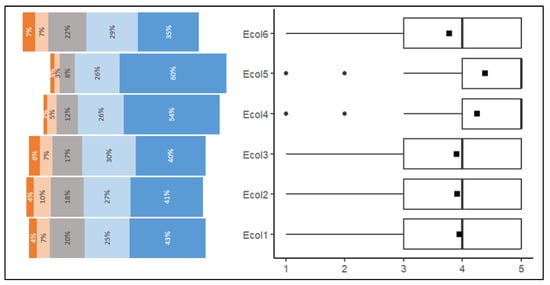 Distribution of answers in the Ecological Usefulness construct. Source: own study. Note: the mean of the responses for the question is marked on the box plot with a square, and outliers with dots.