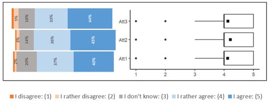 Reactions to two out of three statements of the tested construct differed significantly, also due to the size of the respondents’ towns: Att1 and Att2. After conducting post hoc tests, it turned out that this significance results from the differences between the opinions of the inhabitants of small towns, who assessed them more favorably than the inhabitants of medium-sized towns (p-value for Att1: 0.012 for Att22: 0.014).