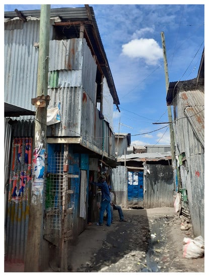 Informal Settlements (ISs) are a widespread phenomenon in cities in the global south. In Sub-Saharan Africa (SSA), about 56% of the urban population lives in ISs [1]. With an annual urban growth rate of 4% [2] paired with a lack of affordable, developed land, inadequate city planning, and inefficiently performing public governance [3,4], ISs will continue to exist and grow. In the absence of space for adequate housing, migrants settle in areas still available and previously avoided by citizens for environmental or health reasons. ISs have often been ignored by the country’s administration in order to prevent creating the appearance of legitimacy for these regions [4,5]. Illegal residents lack political power and do not benefit from political measures [6]. Occurring challenges within the settlements are being neglected or addressed reactively with a focus on resolving short-term risks [7,8], leading to limited improvements in the quality of life of its population. The image of residents has improved over the last decades, and numerous slum upgrading programs have been launched [9,10]. However, the fast-changing environment, their complex, convoluted structure and the illegal status of residents complicate the subsequent introduction of sustainable, long-term programs or an improvement of the infrastructure [11,12]. ISs apply to areas built without legal housing permits and outside the authority and administration system [13,14]. Figure 1 represents the typical view of an IS.