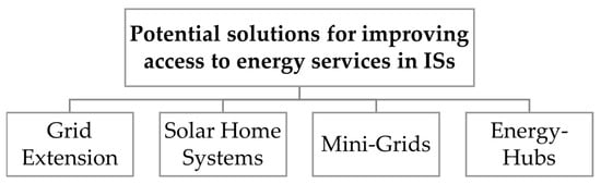 There are several ways to enhance the energy supply in ISs, which can address the above-mentioned energy challenges. The suitability of using different RES depends on a range of factors, such as the potential area of application and the local preconditions. The solutions considered in the framework of this article are Pico Solar and Solar Home Systems (SHS), Micro- and Mini-Grids, and a concept called Energy-Hubs. In the following, Pico Solar and SHS are merged into one category, hereinafter referred to as SHS. Micro- and Mini-Grids are also combined into one category, whereby within this article, the term refers to a classic Mini-Grid that supplies individual buildings, each with its own power connection. The Mini-Grid is defined as a 100% solar-powered island grid with the support of a battery energy storage system (BESS), while the use of diesel generators is not considered. The mentioned renewable energy-based solutions are being compared with the option of Grid-Extension, as displayed in Figure 2.