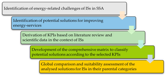 While the assessment of various technologies has already been implemented, these are either limited to specific subject areas, such as economic characteristics, or limited to fewer technologies. The literature does not consider Energy-Hubs, and furthermore, direct comparison and classification of four different solutions have not yet been implemented for the introduction in ISs. Hence, there is an immediate need to perform the analysis to identify a suitable RE-based approach to enhance energy services for better living standards in ISs. The area of consideration is in the (peri-)urban region, specifically ISs, which are, as mentioned, not the scientific focus when discussing the improvement of energy access.
