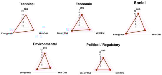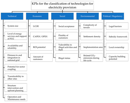 Bhattacharyya [71] gives an overview of methods hitherto applied for the analysis and selection of off-grid systems for rural areas, e.g., the Multi-Criteria Sustainability Assessment. While the term sustainability usually refers to three dimensions, namely, economic, environmental, and social [72], many studies and applications are expanded to include further criteria [71]. Several review articles exist which use indicators to evaluate RES. Moner-Girona et al. [73] examine different countries in terms of their desirability for investment in decentralized electricity technologies by utilizing 52 indicators within the environmental, social, political, and financial areas. Feron [52] measured the sustainability of SHS and Pico-solar according to five pillars (institutional, economic, environmental, and socio-cultural), with each composed of up to five KPIs. The KPIs, which are used to benchmark the different technologies, should cover all areas that the technologies influence. This amounts to the holistic analysis with the technical, socio-economic, environmental, and institutional or policy perspective, as implemented by Ilskog [74]. Since the RES to be assessed should improve the living standards of the inhabitants, the aim is to evaluate the technologies in terms of whether they can mitigate and support solving several challenges that arise in ISs. The KPIs are selected based on local boundary conditions to cover major aspects of ISs and their challenges according to their sphere of influence. The resulting presentation of the aggregated KPIs, with a focus on the technical perspective, is shown in Figure 5.