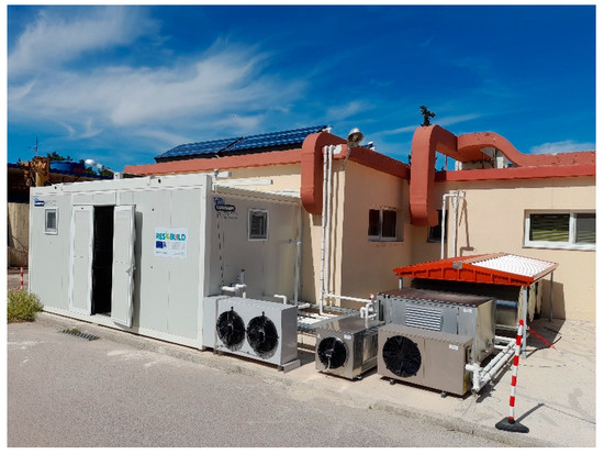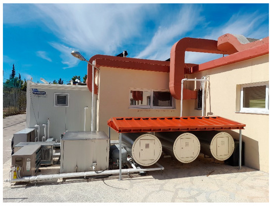 A renewable energy-based system has been developed and installed for providing heating and cooling in a single-floor building with a surface area of 103 m2. The installation’s location is on the NCSRD campus in Athens, Greece. The complete system, with all its functionalities, was commissioned at the beginning of 2022, and afterwards it was set into operation. Except for providing heating and cooling to the four fan coils of the building, the DHW consumption was emulated based on a predefined 24-h profile. The energy system is illustrated in Figure 1, with most of its components (e.g., water tanks, air coils, and pumps) installed outdoors, and the rest installed indoors in the containerized control room.