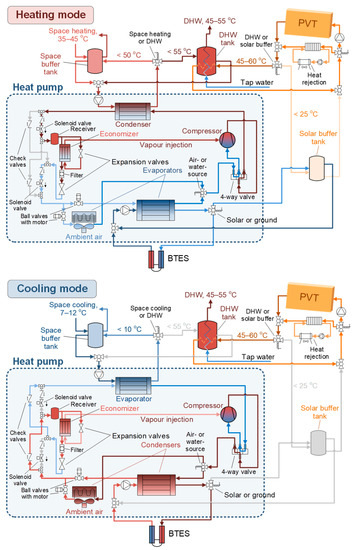 The system diagram is shown in Figure 2 in heating and cooling modes, indicating typical temperature levels as well as the piping connections and the valves that adjust the operation of the different components for higher flexibility. A brief description of the system’s components and main parameters is given next, while further details can be found in Refs. [9,27].