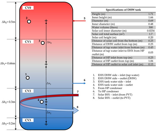 The parameters ,, and in the above equation indicate the presence/contribution, or not, of the PVT, cold/tap water, heat pump, and recirculation in the energy balance of the -th volume. The value of depends on the height of the solar coil, whereas the values for and depend on the position of the inlet and outlet of the external coil and the heat pump, respectively. The value of is related to the operation of the condenser and the external heat exchanger (EHX) for DHW production, and the position of the inlet and outlet of the latter.