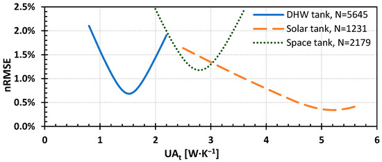 Using this approach, the overall heat transfer coefficient was estimated for all tanks, working with appropriate experimental measurements, i.e., when each tank was inert during the following periods: (a) solar buffer tank, 4 June 2022 and 5 June 2022; (b) space buffer tank, 17 September 2022 and 18 September 2022; and (c) DHW tank, 13 September 2022 to 20 September 2022. As shown in Figure 6, the normalized root mean square error becomes minimum for equal to , for the solar and the space buffer tank, respectively, and equal to for the DHW tank.