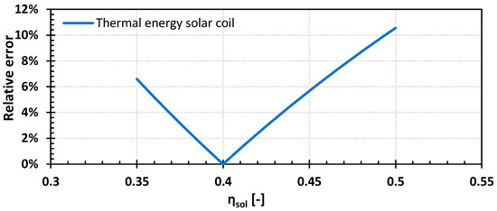 where and are the temperature of the solar fluid in and out the solar coil, respectively, and the temperature of the water from and to the HP evaporator, respectively, and is the mass flow rate of water through the evaporator. In this case, the solar fluid delivers heat to the tank through a coil with efficiency , as given by Equation (15) [37]: