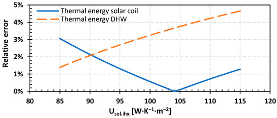 where , are the temperatures of the solar fluid at the inlet (7) and the outlet (8) of the solar IHX, respectively, whereas is the average solar IHX temperature. Moreover, is the mass of the solar fluid in the solar IHX, whereas is the total heat transfer coefficient of the solar IHX.