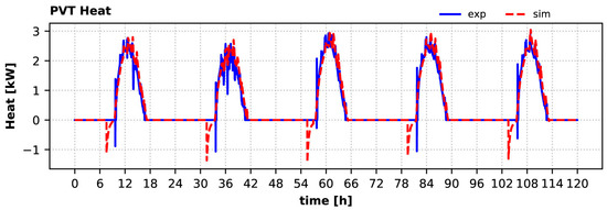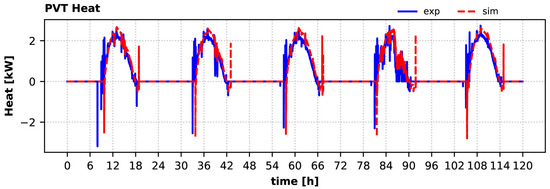 The calculated variation of PVT heat production over the 5-day winter period is in very good agreement with the experimentally measured one as shown in Figure 14, similarly to the summer period case. During this period the measured peak heat production varied from 2.2 kW (second day) to 2.7 kW (third day). The highest relative error for peak heat production was 5.1% during the second day, when solar irradiation variance was high. The model predicts that this heat should always be delivered to the solar buffer tank, as was the case during testing. Moreover, the model predicts that the solar pump should start operating about 1 h before the actual system, but in that case, it could not keep a positive temperature difference, leading to the removal of a small amount of heat from the tank (negative heat value).