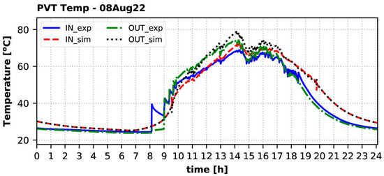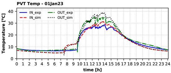 Temperature of the solar fluid at the inlet (IN) and the outlet (OUT) of the PVT collectors on 1 January 2023: experiment vs. simulation.