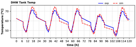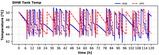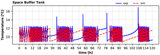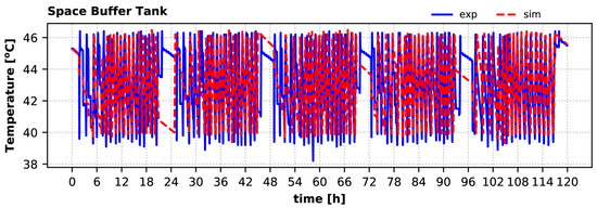 Calculated and experimental hot water tank temperatures are given in Figure 18. The sharp increases of this temperature correspond to the HP condenser’s operation for charging this tank. Although the calculated buffer temperature variation does not coincide with the experimental, it is kept well within the setpoints (allowing a small overshoot beyond the 50 °C threshold, since the flag is set at the beginning of each timestep), and the tank fully covers the DHW demand during winter. The calculated daily maximum DHW tank temperature is up to 1.9% lower than the measured value (second day), whereas the relative error for the daily average tank temperature varies from −0.2% (first day) to 2.6% (second day).