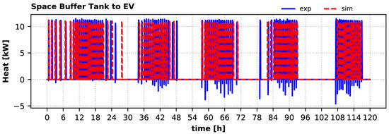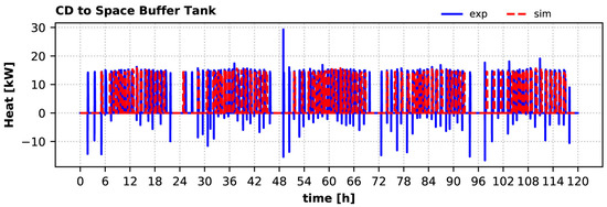 When the DHW tank does not need additional heat, the HP condenser provides heat to the space buffer tank for the system (if requested) to also cover the building’s heat demand in the winter period. The charging process of the space buffer tank by the heat pump is shown in Figure 19. The model estimations agree well with the experimental observations. The calculated mean heat delivered to the space buffer tank by the condenser is up to 2.7% lower than the measured one (14.2 kW calculated against 14.6 kW measured, third and fourth days) Once again, the negative heat values are caused during start-up, when the return piping is still cold.