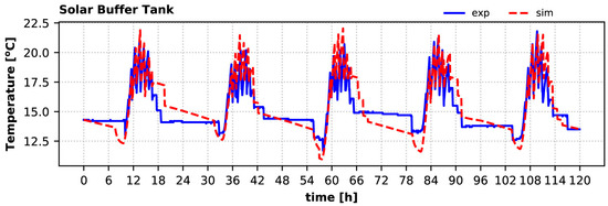 Solar buffer tank temperature variation during the winter period: experiment vs. simulation.