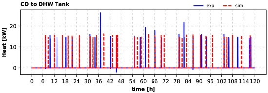 During this 5-day winter period, the experimental observations showed that the collectors did not provide any heat to the DHW tank; thus, the heat pump was needed to keep the tank within the appropriate temperature range for DHW production. This was also perfectly aligned with the findings of the simulation. Time variation of the heat provided by the HP condenser to the DHW tank over the 5-day winter period is shown in Figure 17 as experimentally measured and calculated by the model. The calculated heat when the HP charges the DHW tank agrees with the measurements, however the model predicts fewer timesteps in which the DHW tank needs additional heat from the HP and at different times. The measured mean heat delivered to the tank by the condenser is ~14.7 kW, whereas the calculated is ~15.3 kW, i.e., 4.1% higher.