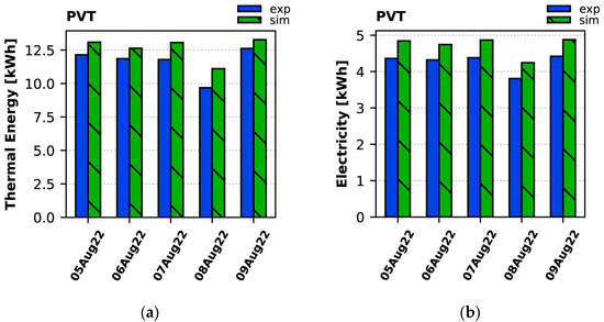 Daily production of (a) thermal energy and (b) electricity by the PVT collectors during the summer period: experiment vs. simulation.