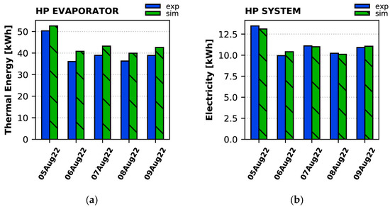 Daily (a) heat removed by the HP evaporator, and (b) total electricity consumption of the HP during the summer period: experiment vs. simulation.
