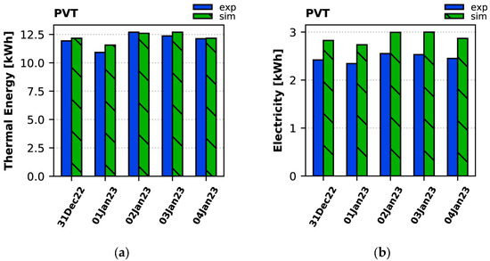 Daily production of (a) thermal energy and (b) electricity by the PVT collectors during the winter period: experiment vs. simulation.