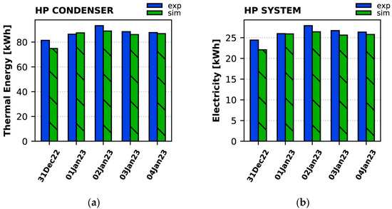 Daily (a) production of thermal energy by the heat pump, and (b) total electricity consumption of the HP during the winter period: experiment vs. simulation.