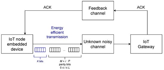 The general rate-adaptive communication system model that we consider in our research is presented in Figure 1. We investigate a system based on a low-complexity embedded device that acts as an IoT node and can function in a variety of noisy environments, regardless of the communication channel. The communication scheme automatically adapts to the channel; hence, the system can work properly in a wide range of noisy environments. The developed system is classified as a type II hybrid automatic repeat request (HARQ) [6], which involves an initial transmission of a length-K block, followed by transmissions of shorter length-P chunks. The receiver combines these chunks in a decoding scheme, which signalizes the successful decoding by sending positive acknowledge (ACK), after receiving as many chunks as are needed for correct decoding. The coding scheme that we employ is PBRL-LDPC, constrained to quasi-cyclic (QC) submatrices, which we refer to as QC Raptor-like (RL) coding (QC-RL-LDPC).