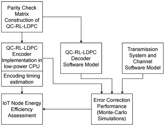 The QC-RL-LDPC encoder is implemented in low-power microcontroller unit from the STM32 family, as will be presented in Section 5 and Section 8.1. All the remaining parts of the communication model considered, presented in Figure 1, are implemented as software models developed in the Matlab environment. The research methodology is outlined in Figure 2.