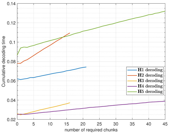The microcontroller with the developed decoding algorithm is able to decode information portions efficiently, with lower computing time requirements if the received signal is of high quality (with small number of errors) and higher computing time consumption if the received signal is of low quality. In case of an erroneous received signal, the algorithm adapts and continues decoding until the correct result is achieved. During decoding, subsequent parity checks are used from . With every additional chunk, the total (cumulative) decoding time increases, as shown in Figure 8. The figure provides averaged measured cumulative decoding time versus the number of chunks required for successful decoding. This means that the first (leftmost) point in every curve presents the time of decoding just the core HR part (with 0 additional chunks), and then the subsequent points present the total decoding times if the number of required chunks increases.
